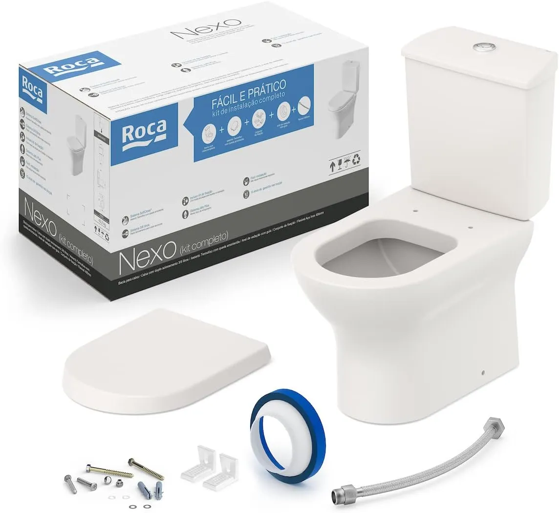 O Kit de Bacia com Caixa Acoplada com Assento Termofixo Nexo Roca é a escolha ideal para quem busca durabilidade e conforto. Este modelo se destaca pela tampa com assento termofixo, que proporciona maior resistência e suavidade ao toque, evitando riscos e aumentando a vida útil do produto.